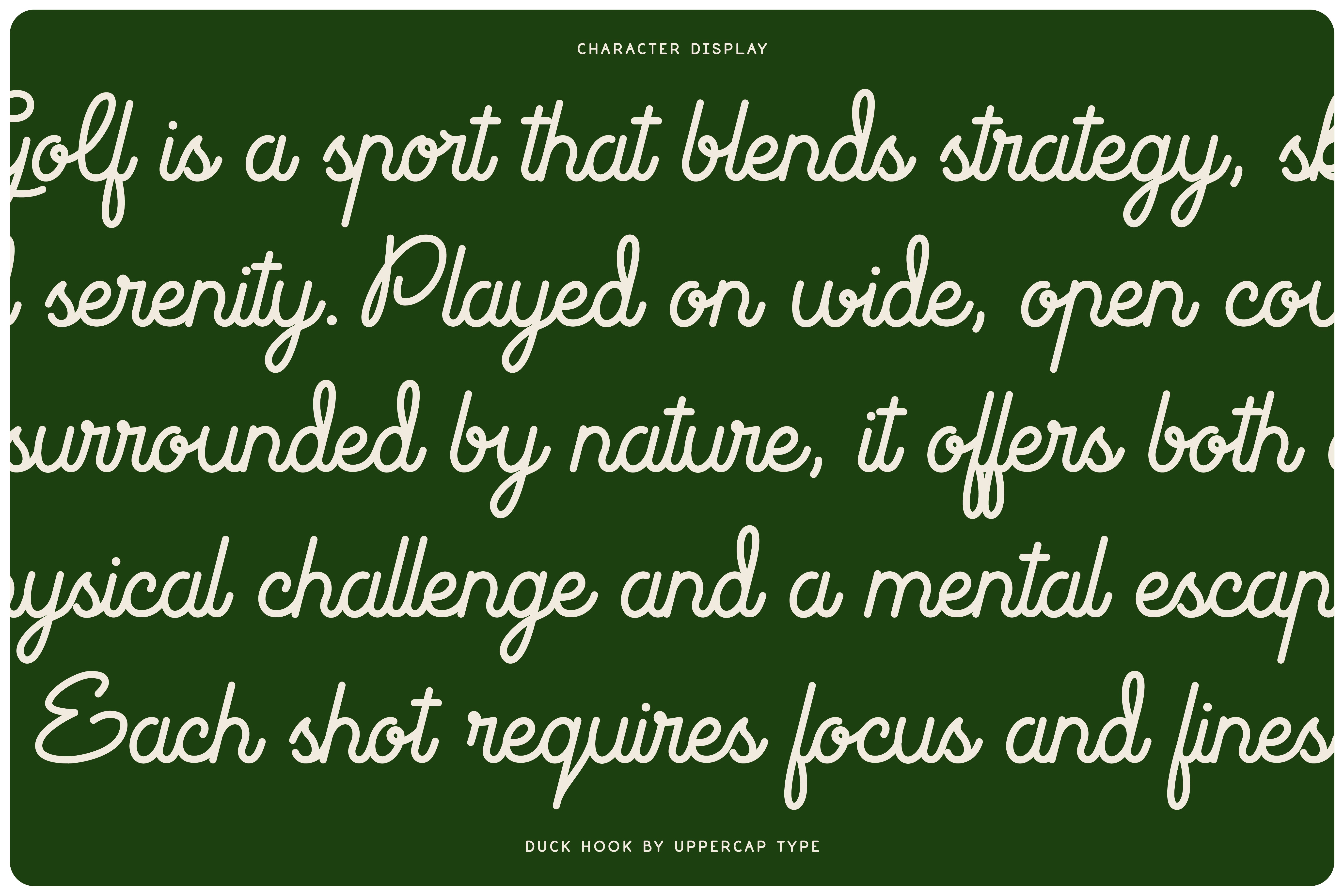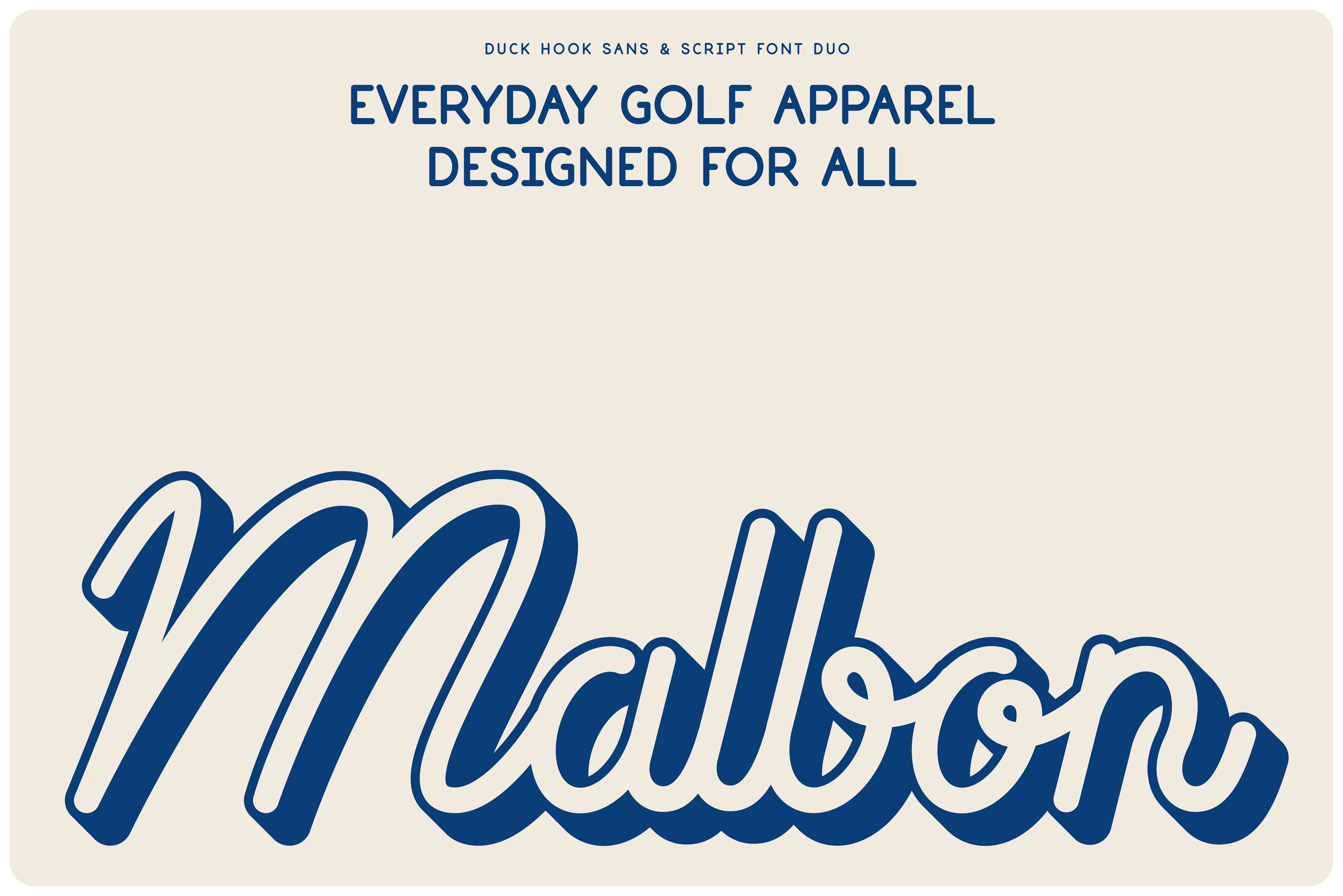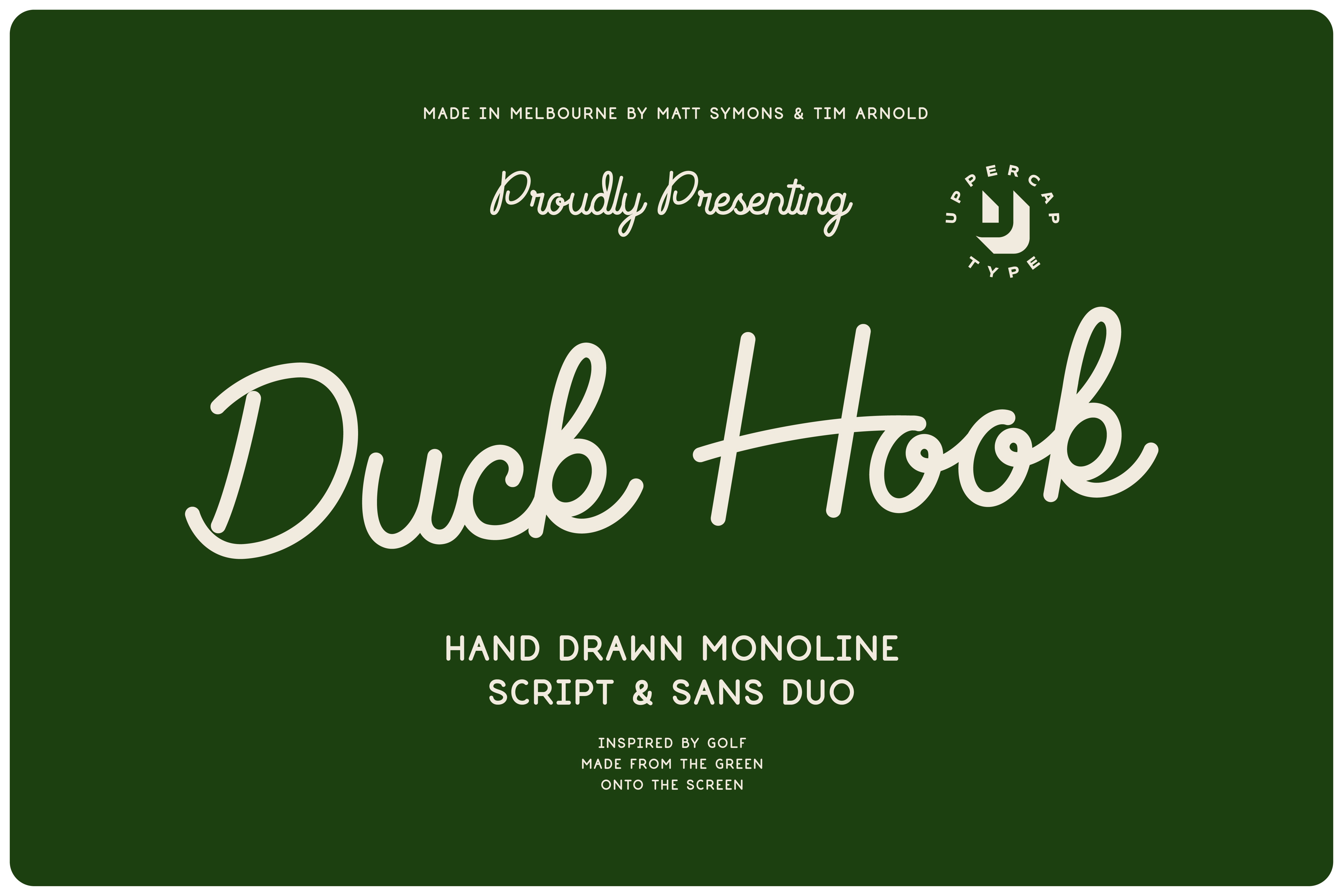 Introducing Duck Hook! A playful font duo inspired by the quirks and charm of golf. With a smooth monoline script and a clean sans, it's perfect for apparel, clubhouse menus, logo designs, posters, typographic layouts or just swinging your design game into full gear. Made by hand and includes all essential characters and punctuation.